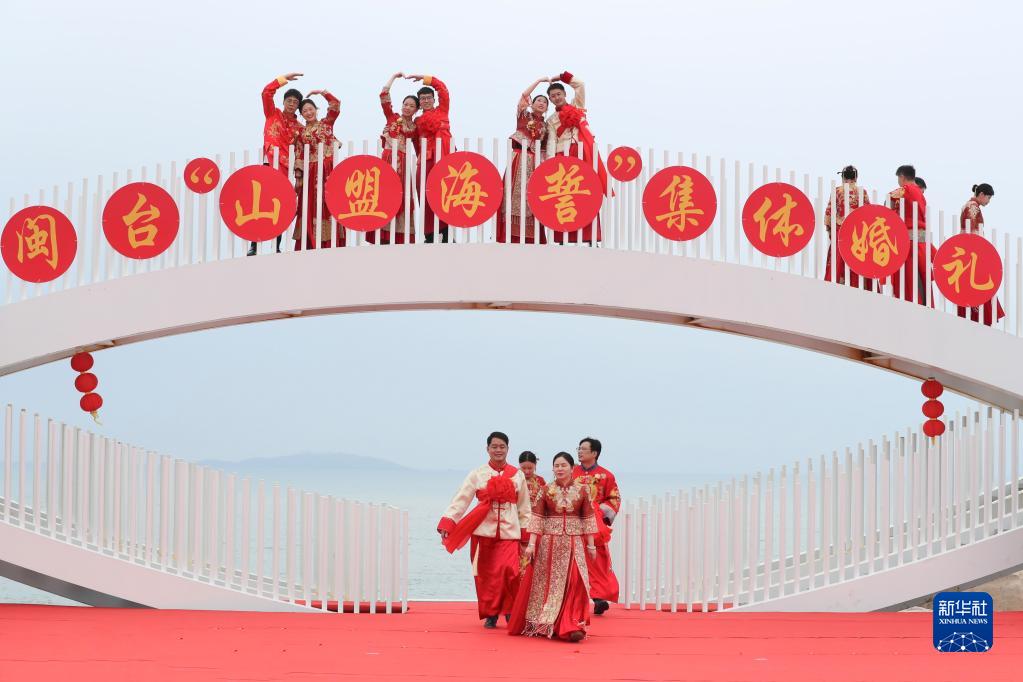 当日,一场以“爱情恒久远、幸福长相伴”为主题的闽台“山盟海誓”集体婚礼暨2023年闽台婚姻家庭交流活动在福建省福州市平潭县举办。21对闽台新人身穿红色中式婚服,手牵红绣球,行跨火盆、踩瓦片、扎绣球和“合茶”、“合卺”、“海誓”等闽台传统结婚礼仪,结下跨越海峡的姻缘。