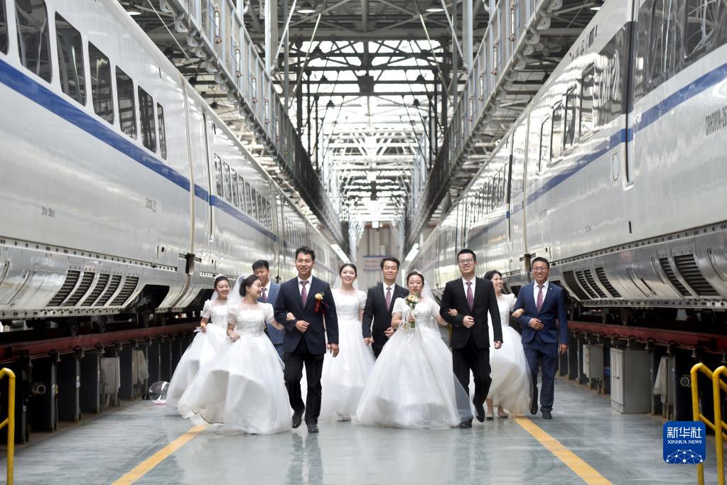 5月20日,新人们以休整中的动车组列车为背景拍摄婚纱照。