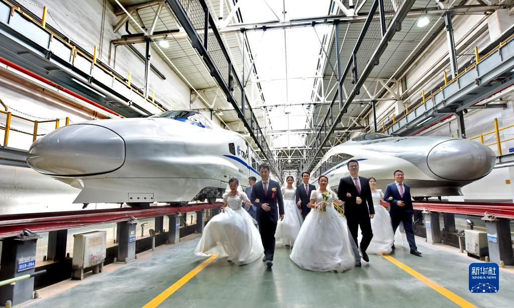 5月20日,新人们以休整中的动车组列车为背景拍摄婚纱照。