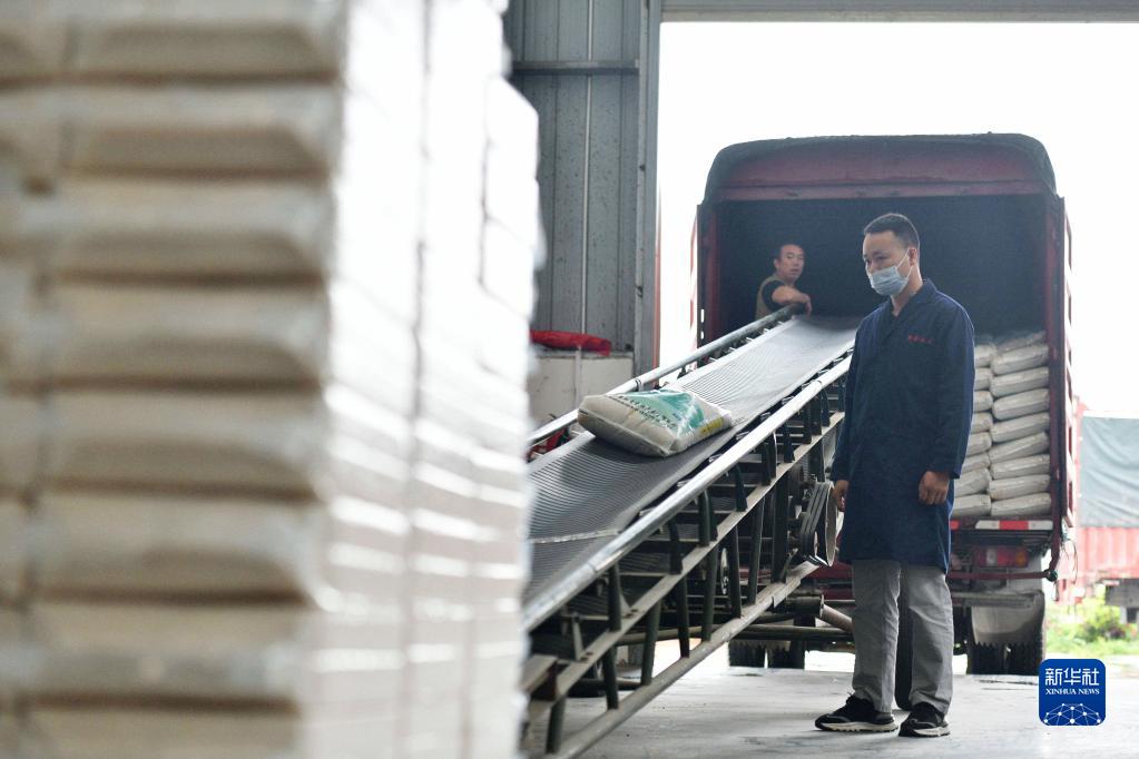 5月20日,工人在贵州省黔东南苗族侗族自治州施秉县桃子湾工业园区一家大米加工企业运输大米。