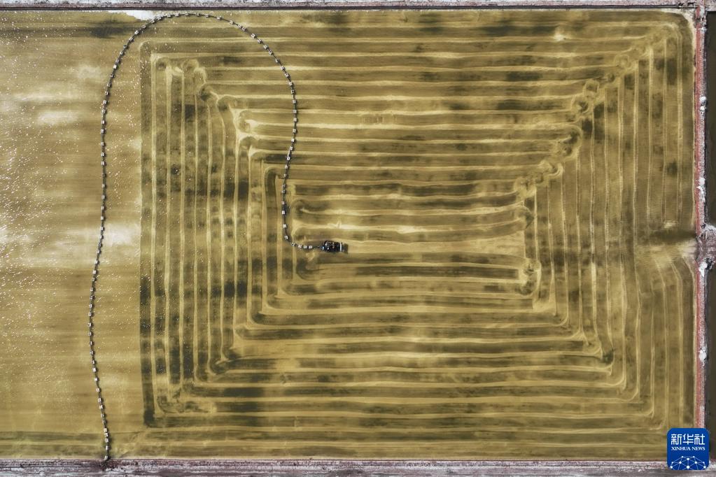 5月14日,唐山市曹妃甸区南堡盐场的工人在盐田内使用机械设备收获春盐(无人机照片)。