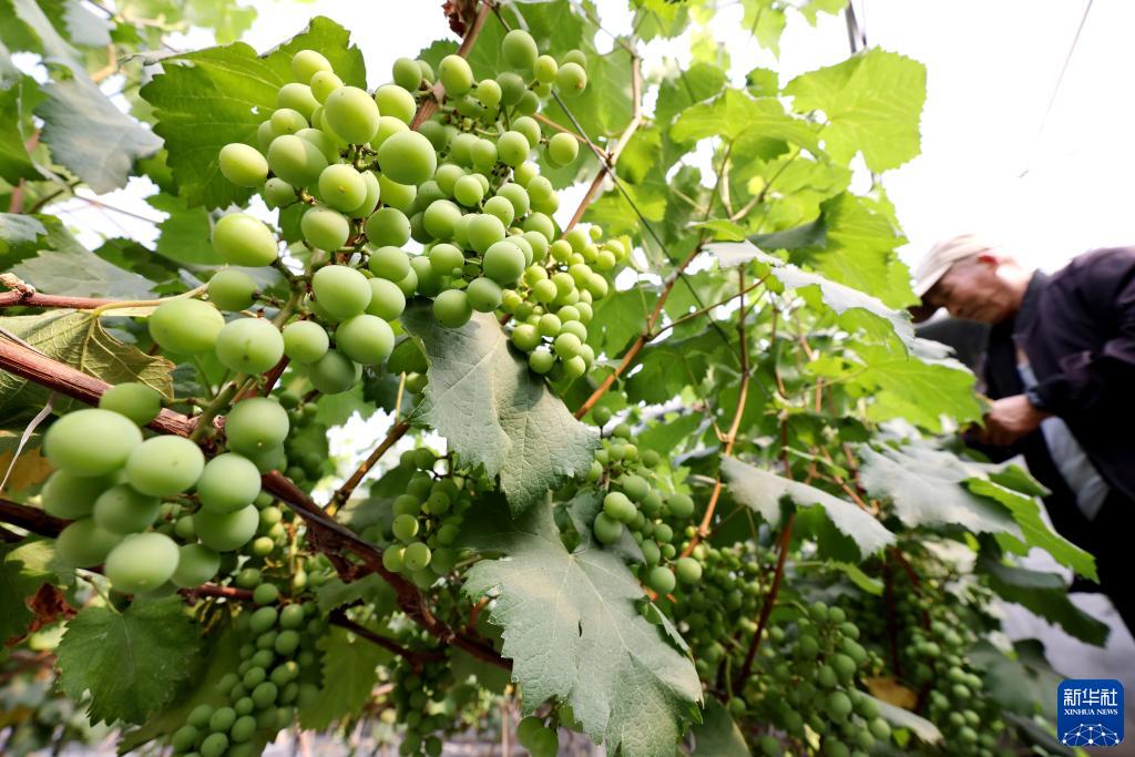 5月20日,在山东省枣庄市市中区一家农业合作社,农民在田间管理葡萄。
