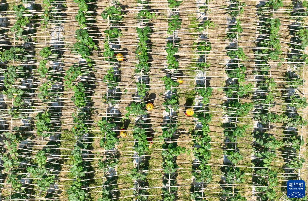 5月19日,在湖南省衡阳市衡山县长江镇石桥铺社区,农民在南瓜地里固定瓜藤(无人机照片)。
