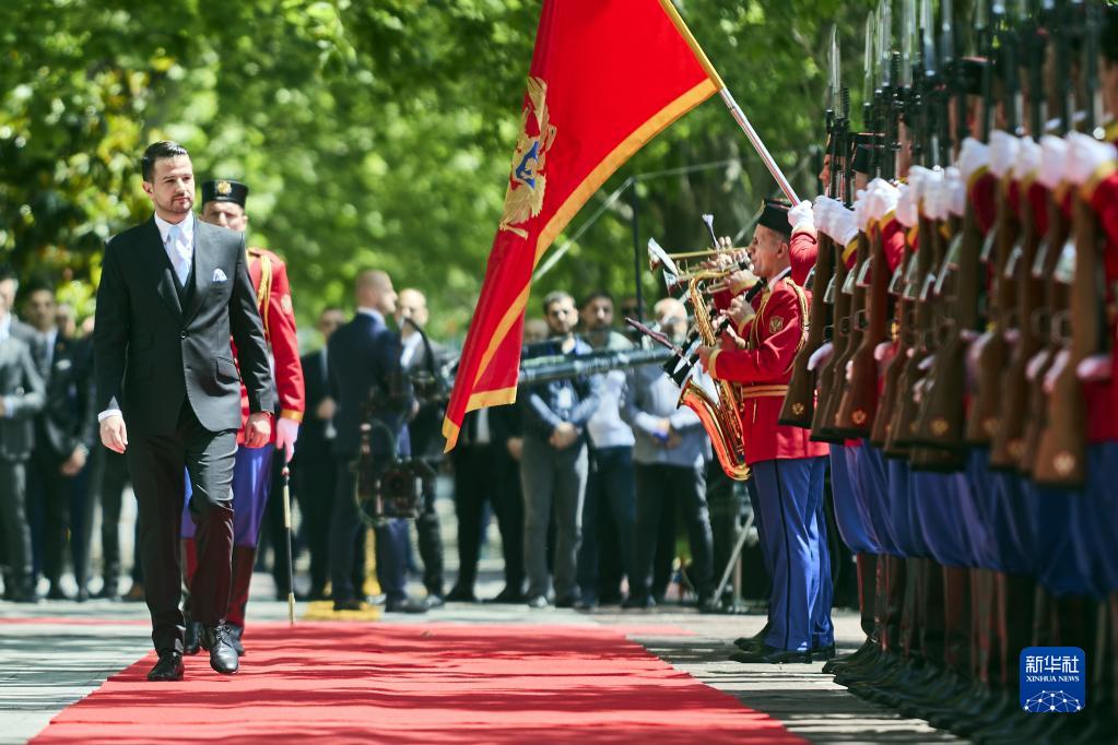 5月20日,在黑山共和国首都波德戈里察,黑山共和国当选总统米拉托维奇(左)在就职仪式现场检阅仪仗队。
