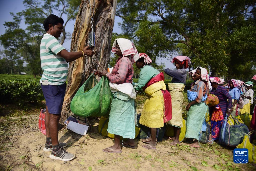 这是2021年11月26日,采茶工人在印度阿萨姆邦纳加奥恩地区的茶园称量采摘的茶叶。