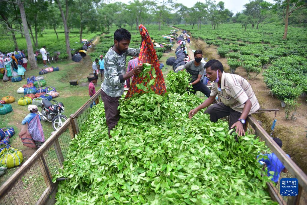 这是2021年6月1日,工人在印度阿萨姆邦纳加奥恩地区的茶园里收获茶叶。