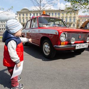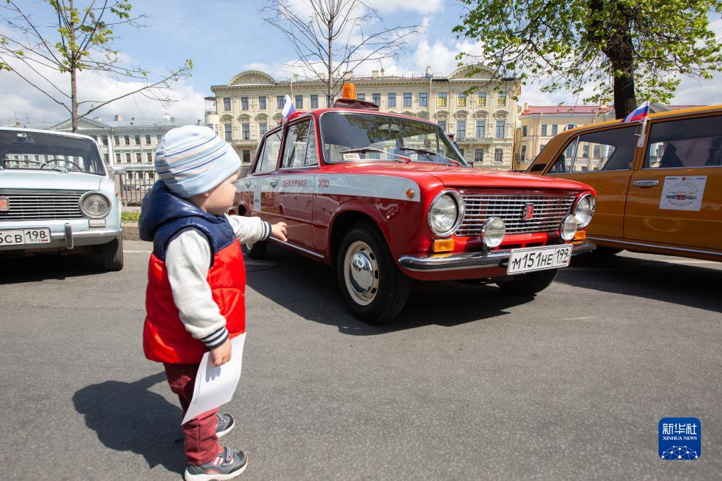 5月20日,小朋友在俄罗斯圣彼得堡参观街头老爷车展。