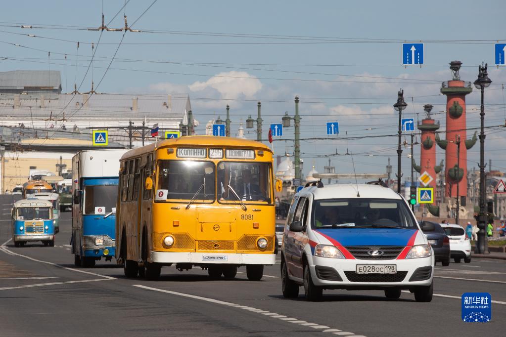5月20日,各式老爷车在俄罗斯圣彼得堡街头巡游。