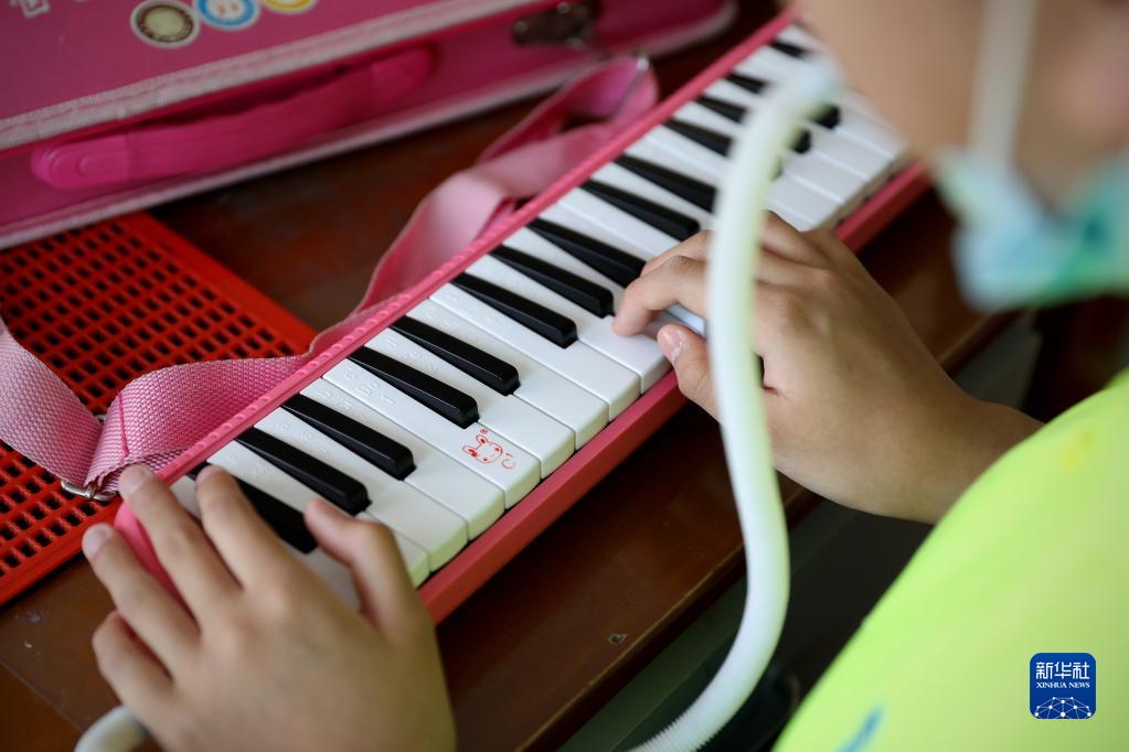 5月19日早上,庄岩的学生在进行口风琴演奏练习,这种普通的乐器对于视障孩子是很有挑战性的。