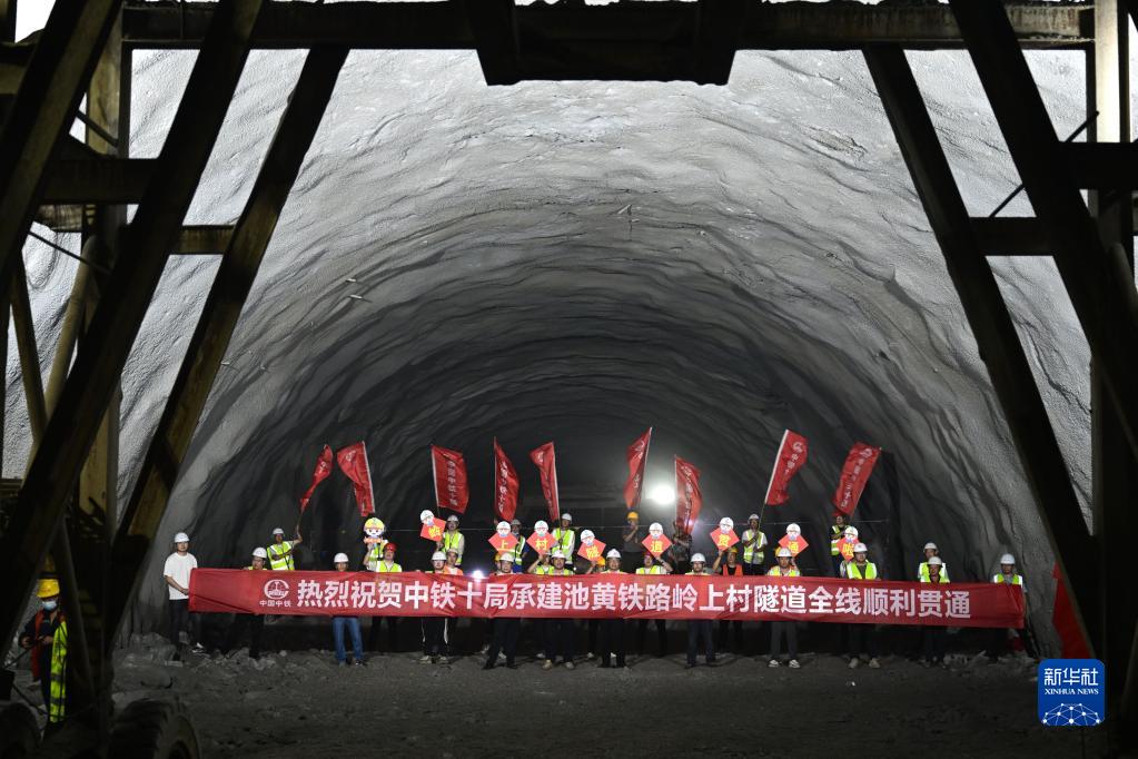 5月21日,中铁十局施工人员在池黄铁路岭上村隧道内庆祝隧道贯通。