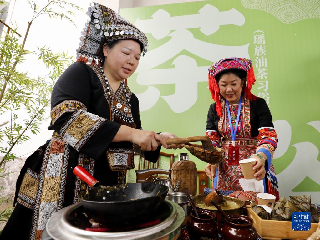 5月21日,在茶文化非遗项目展示交流活动上,工作人员展示瑶族油茶习俗。