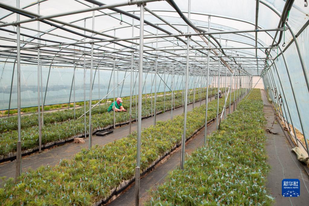 5月20日,在伊春森工集团红松种苗繁育基地,工作人员在养护轻基质红松嫁接苗。
