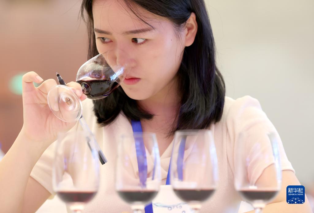 5月21日,参赛选手在2023年中国葡萄酒品酒师技能大赛实操环节的比赛中。