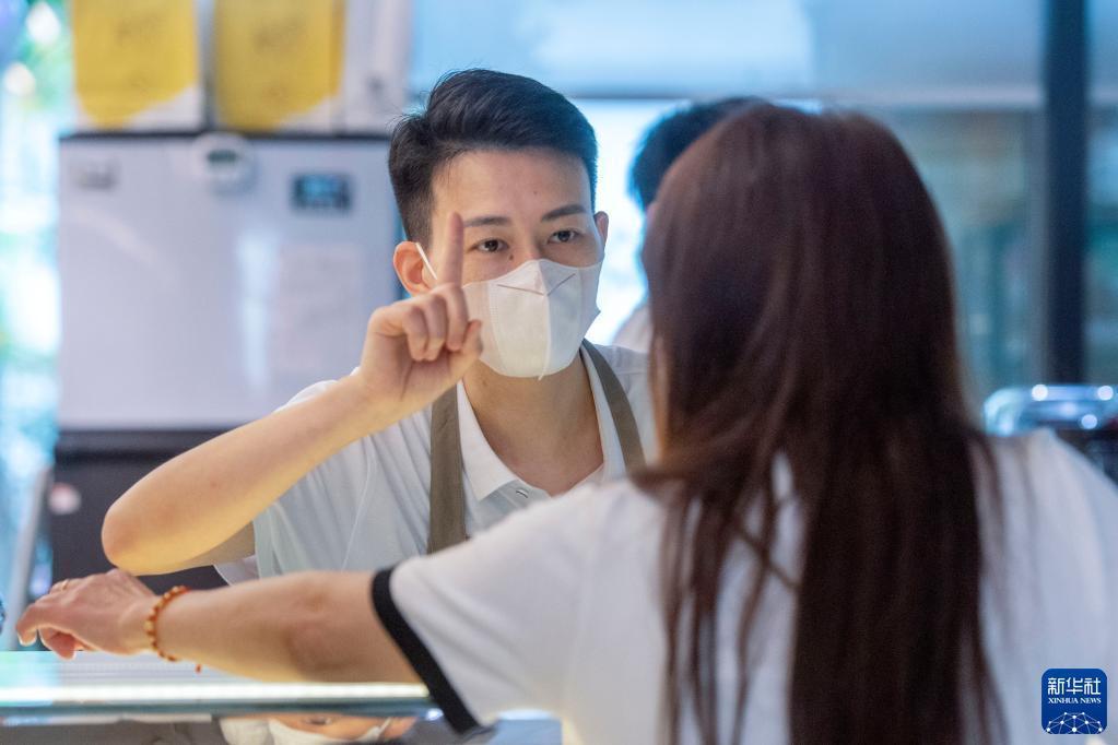 5月5日,在位于重庆市渝北区松山医院内的一角咖啡厅内,张凌云(左)与顾客通过手语进行交流。