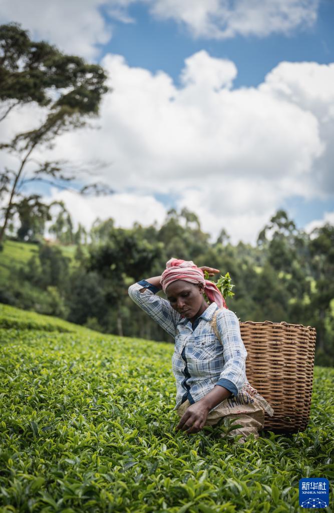 这是2023年5月4日,工人在肯尼亚首都内罗毕附近的茶园采茶。