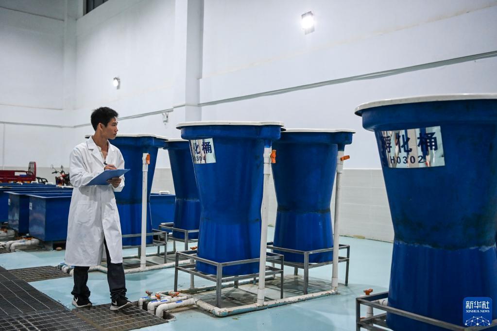 5月20日,技术人员在广西大藤峡水利枢纽工程鱼类增殖放流站查看鱼苗孵化桶。