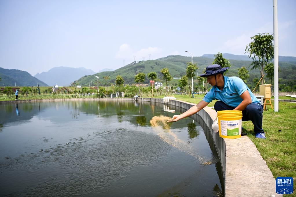 5月20日,技术人员在广西大藤峡水利枢纽工程鱼类增殖放流站向户外育鱼池内投喂饲料。