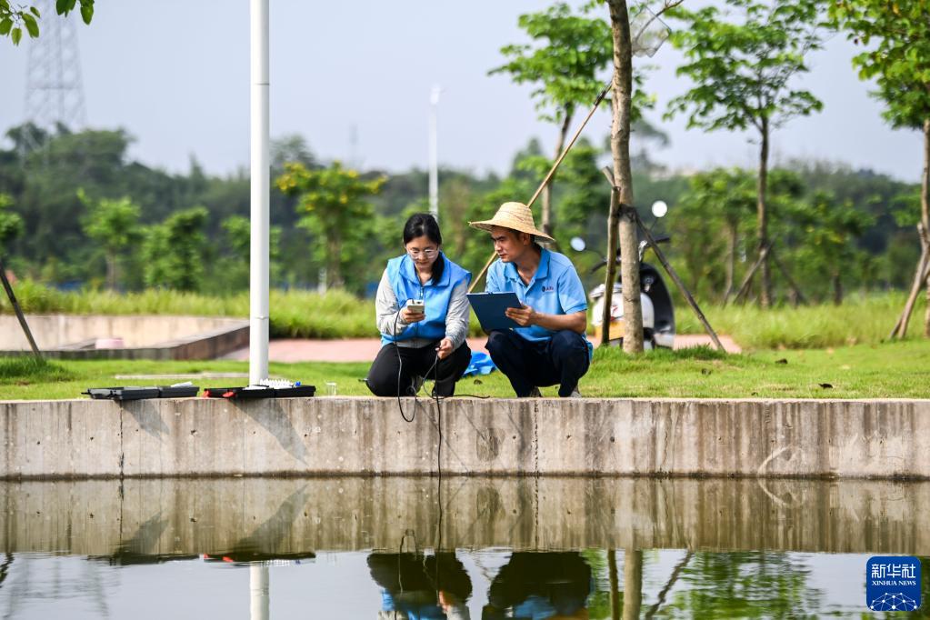 5月20日,技术人员在广西大藤峡水利枢纽工程鱼类增殖放流站监测室外亲鱼池水质。
