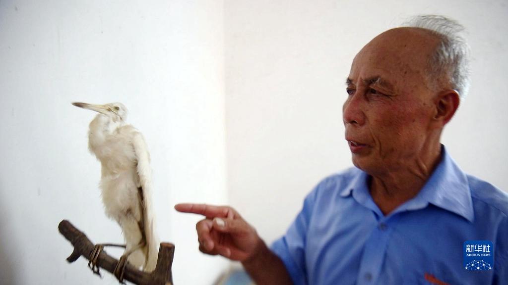 莫积瑞老人介绍白鹭标本的制作过程(5月20日摄)。