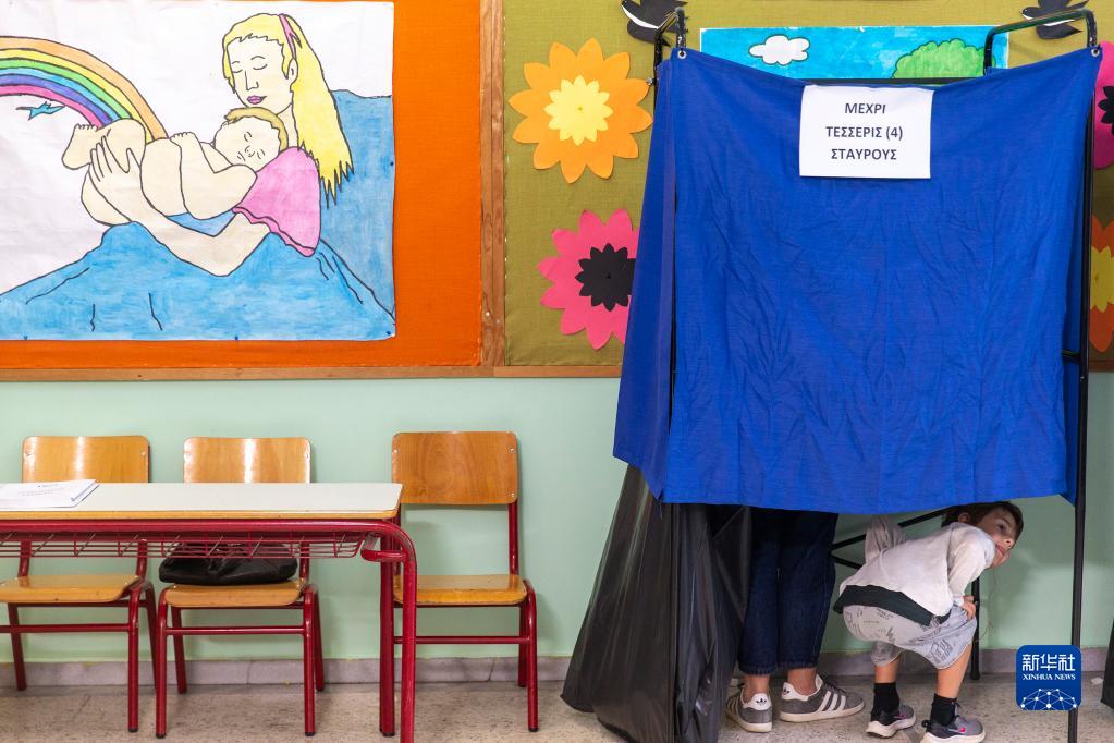 5月21日,一名选民带着孩子在希腊雅典一处投票站参加投票。