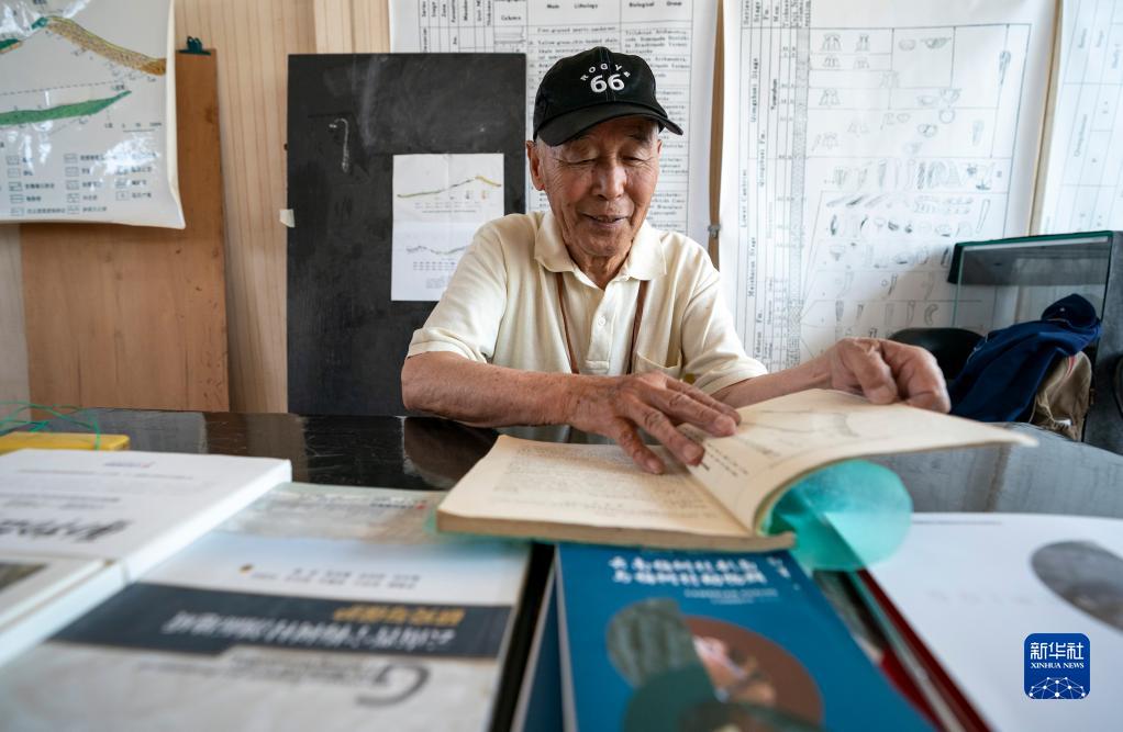张世山在收藏化石的标本馆内翻阅古生物化石书籍(5月10日摄)。