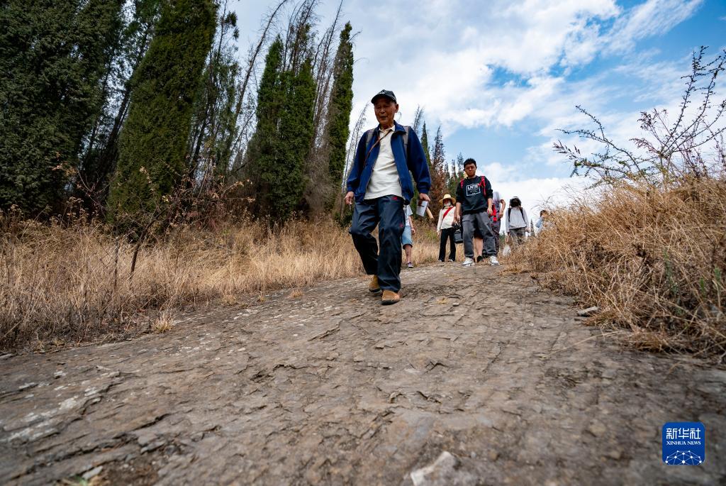张世山(左一)在巡护梅树村剖面(5月10日摄)。