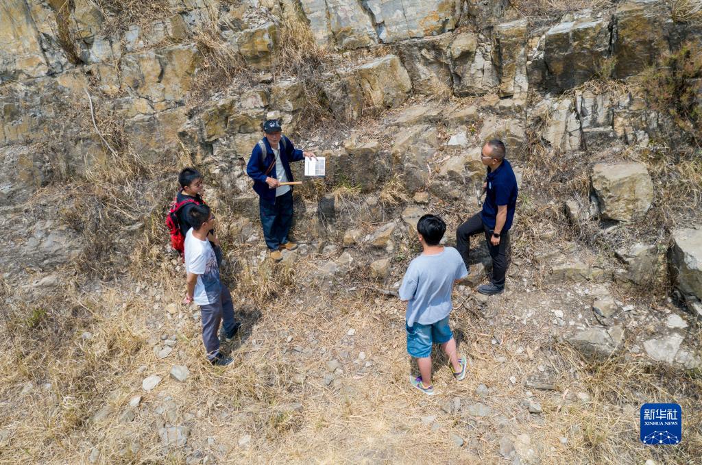 张世山(右三)在梅树村剖面一处岩石断层前给中国前寒武系省级地质自然保护区管护局的几个年轻人讲解(5月10日摄,无人机照片)。