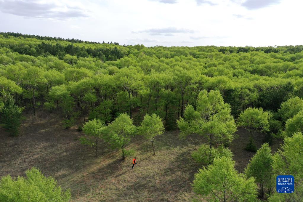护林员马裕在林间巡查(5月17日摄,无人机照片)。