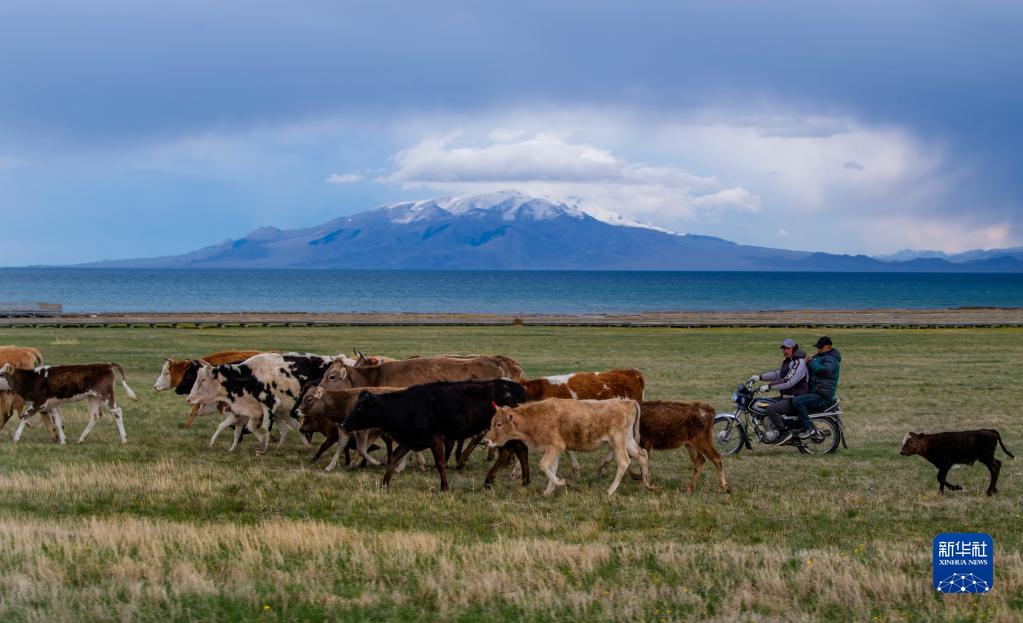 5月21日,牧民在新疆赛里木湖边放牧。