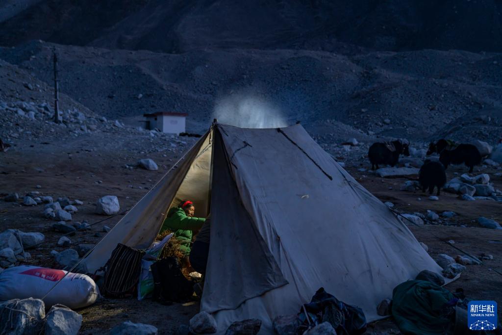 驮运物资上山的前夜,牦牛工在珠峰登山大本营附近的帐篷里休息(5月17日摄)。