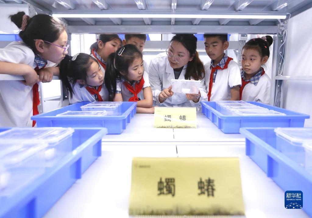 5月22日,在中国农业科学院青岛特种作物研究中心试验基地,工作人员为小学生讲解农作物害虫绿色防控技术。