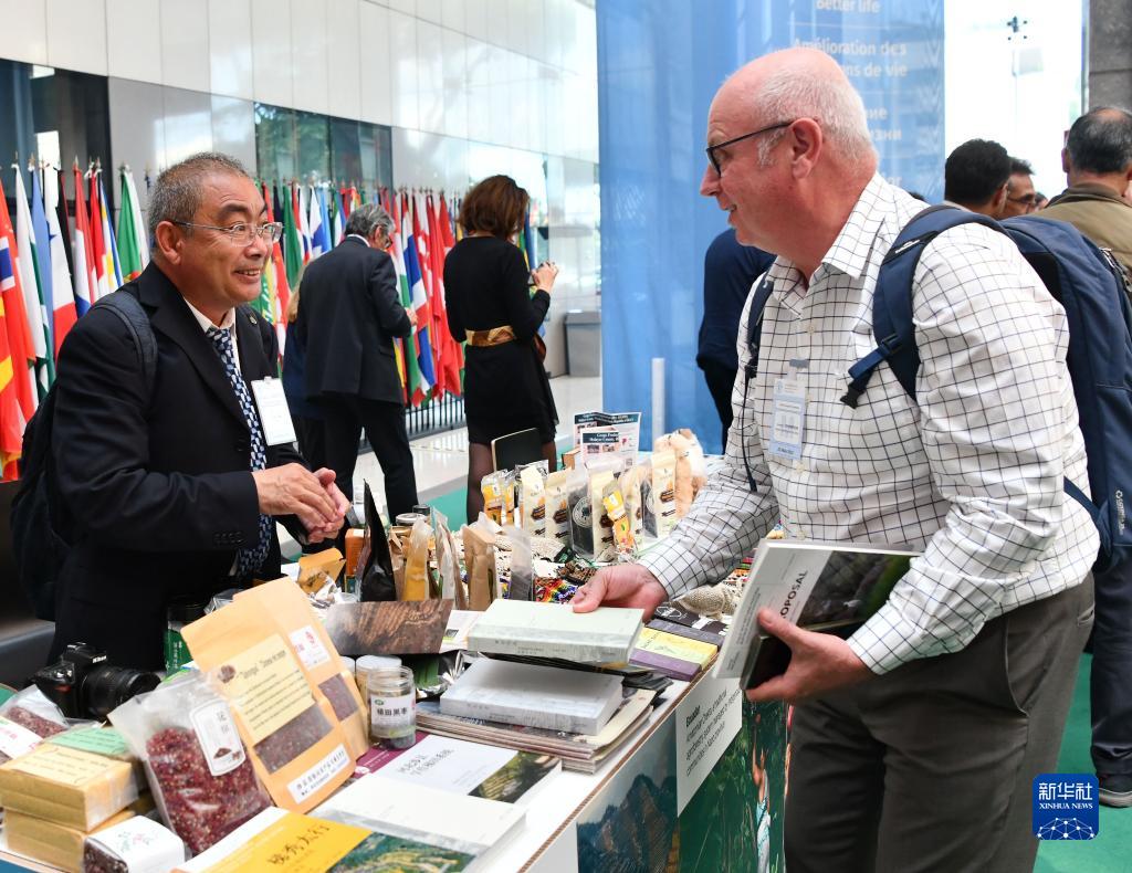 5月22日,在意大利罗马的联合国粮农组织总部,河北涉县旱作石堰梯田系统的代表与参观者互动。