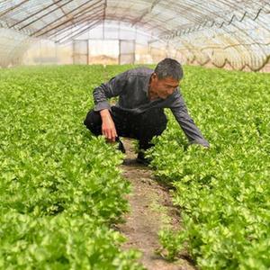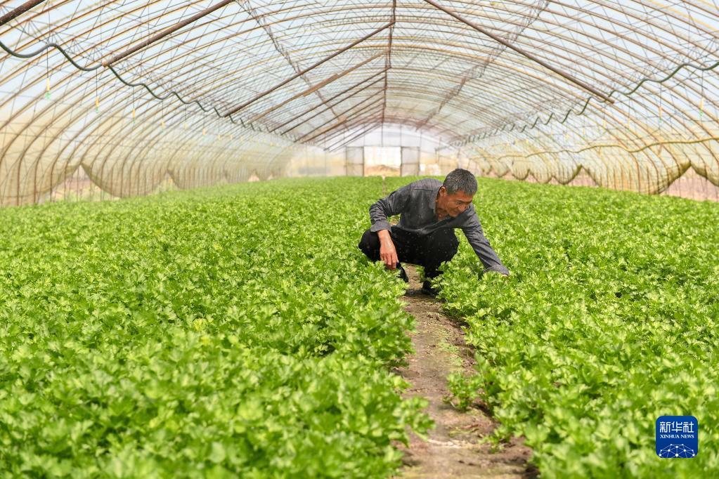 5月23日,在吉林省长春市九台区卡伦湖街道东风村,农民在查看蔬菜长势。