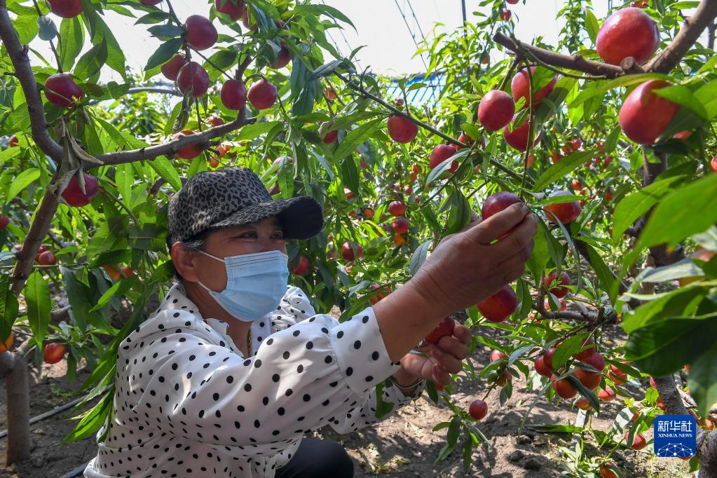 5月23日,在吉林省长春市九台区卡伦湖街道东风村,农民在查看油桃生长情况。