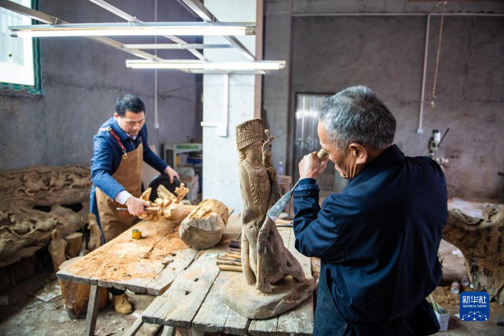 5月23日,在洞口县岩山镇阳家山村,洞口木雕非遗传承人傅立先(左)和父亲傅金林在创作木雕作品。