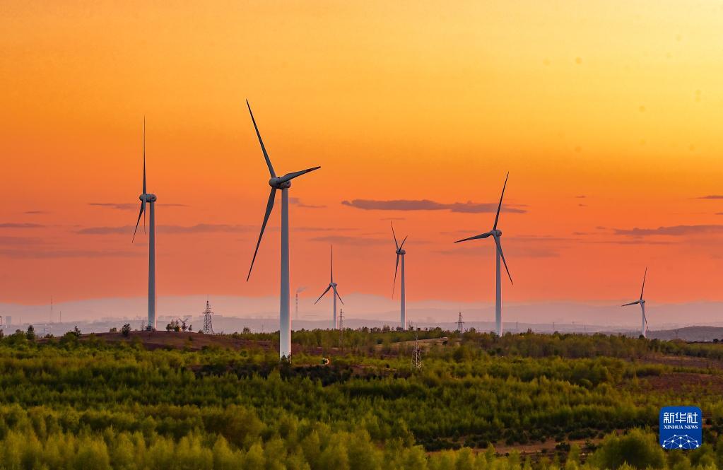 5月23日清晨拍摄的兴安盟乌兰浩特市呼和马场风力光伏发电场内的风机。
