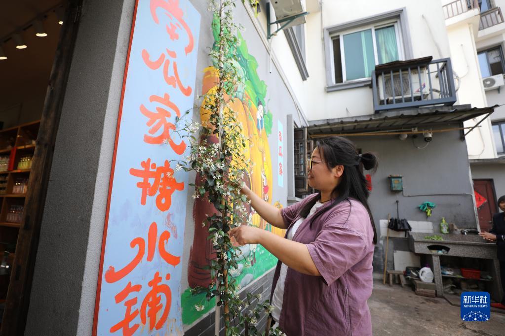 5月23日,在浙江省义乌市李祖村,“南瓜家糖水铺”的主理人封玲在整理庭院内的植物。