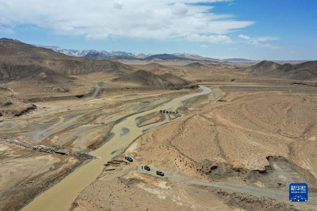 科考队员在新疆东昆仑库木库里盆地古尔嘎赫德河进行水文巡测工作(5月22日摄,无人机照片)。