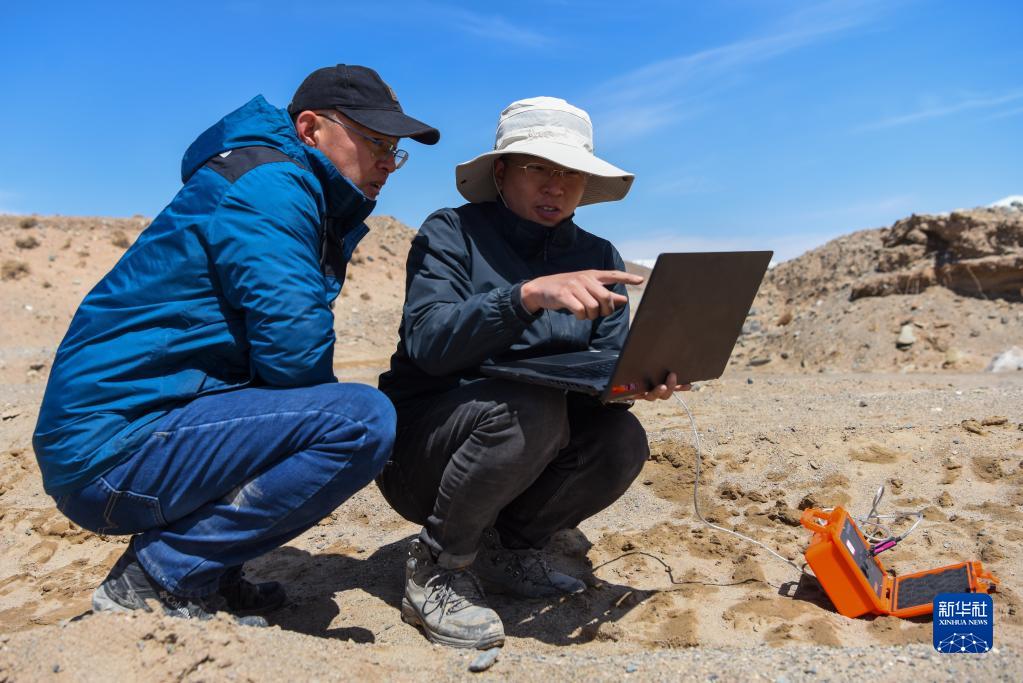 科考队员在新疆东昆仑库木库里盆地核对水流数据(5月22日摄)。
