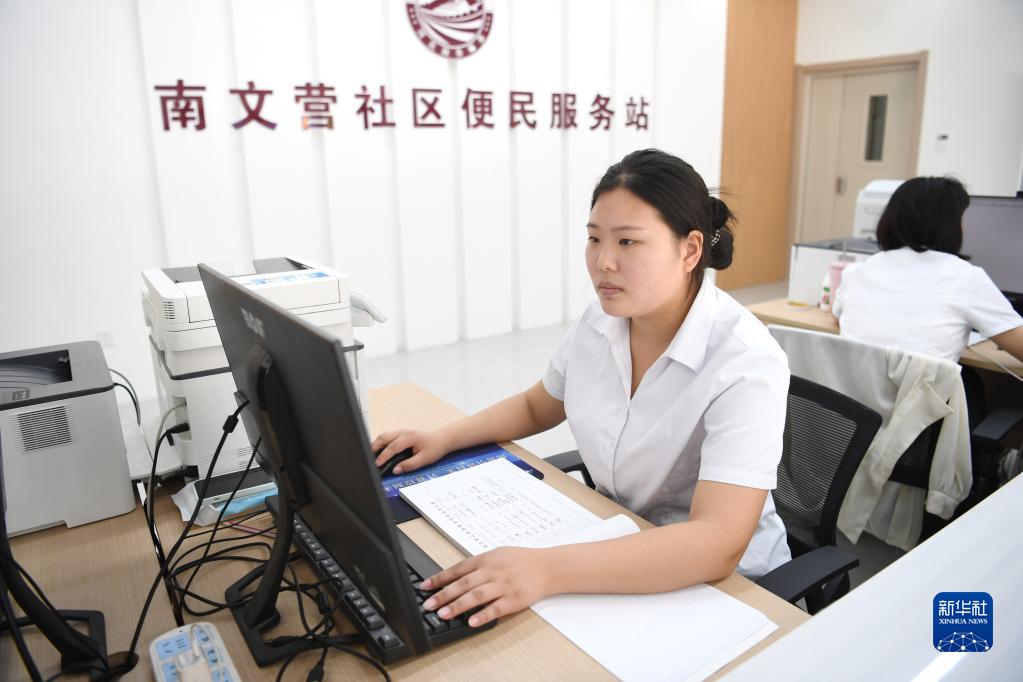 河北雄安新区容东片区南文营社区便民服务站工作人员在工作(5月23日摄)。