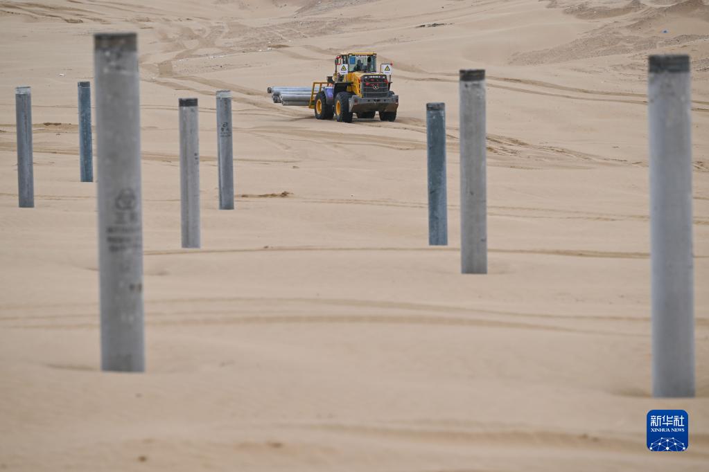 5月24日,机械工程车辆在达拉特旗库布其沙漠中运输建材。