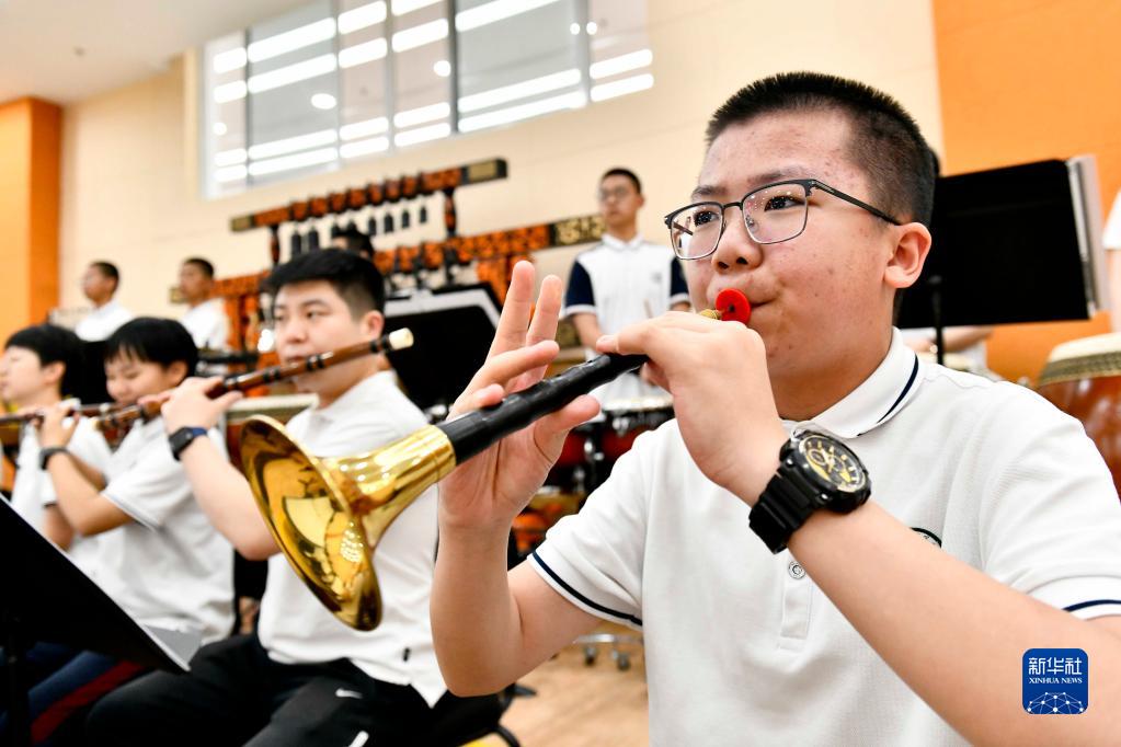 5月23日,在济南市历城二中闻韶艺术馆,同学们在练习国乐曲目。