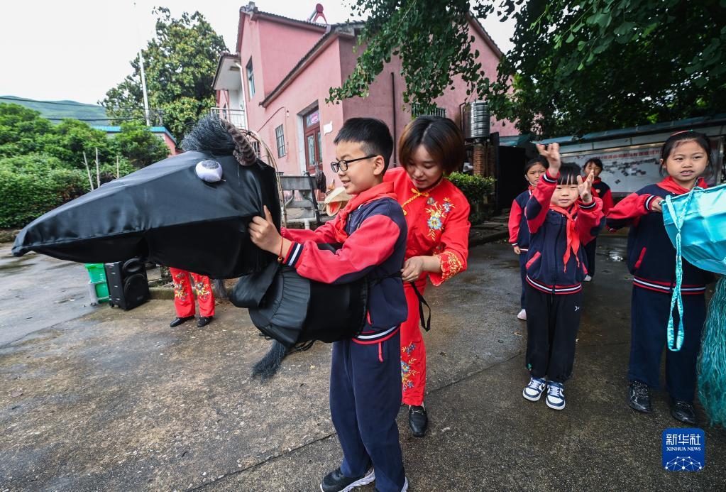 5月24日,长兴县煤山镇中心小学的学生在新民村学习新民马灯舞蹈。