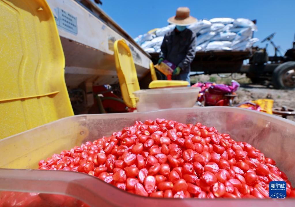 5月24日,唐山市丰南区王兰庄镇的农民将准备播种的玉米种子倒入播种机。