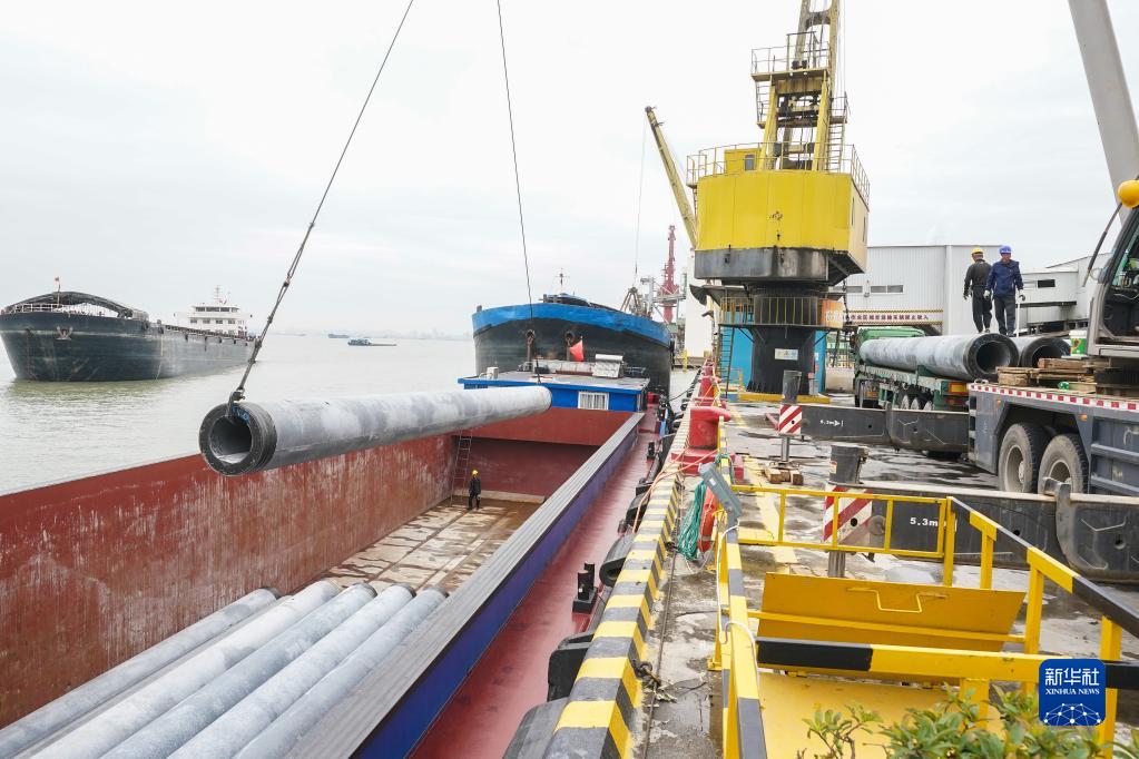 5月24日,工人在码头上吊装建材产品,准备外运。