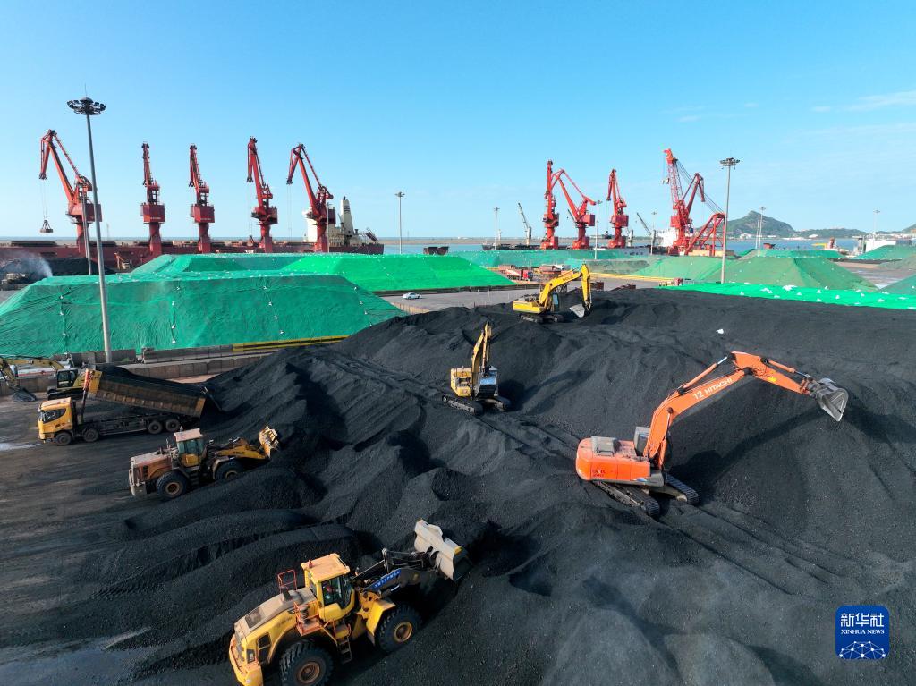 5月24日,大型机械在江苏省连云港港煤炭码头堆放储存刚从货轮卸运的电煤(无人机照片)。