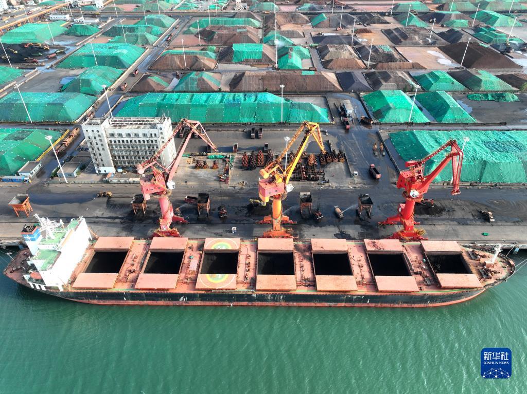 5月24日,货轮在江苏省连云港港煤炭码头卸运电煤(无人机照片)。