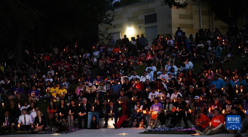 5月24日,在美国得克萨斯州小城尤瓦尔迪,人们参加守夜仪式悼念校园枪击遇害者。