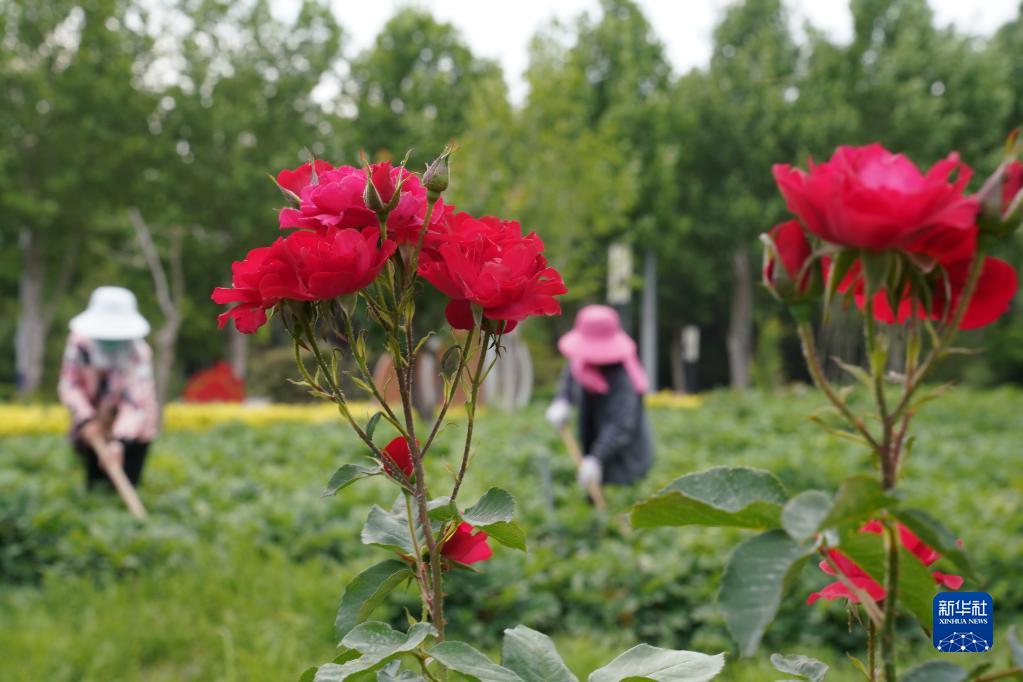 5月24日,工人在河北省沙河市冶铁文化园养护绿地。