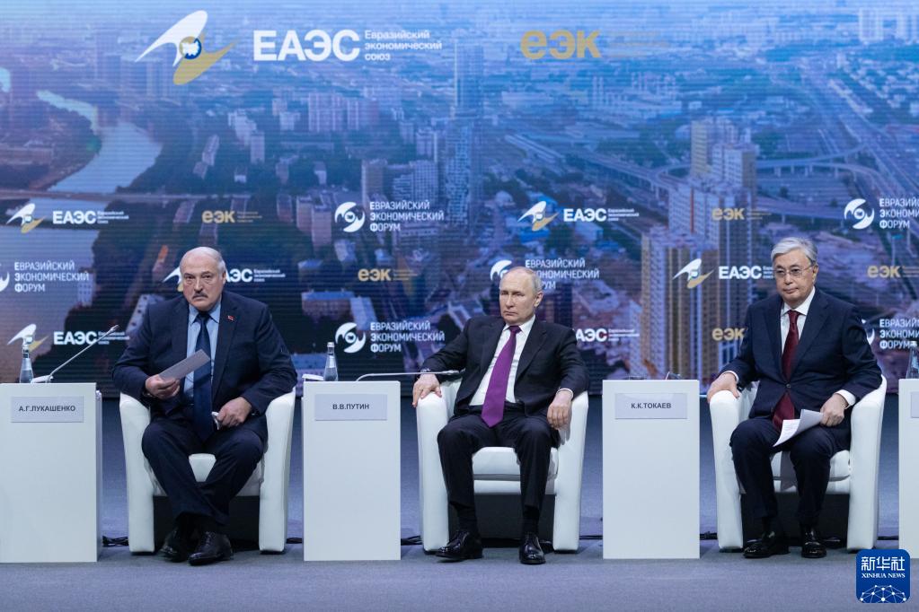 5月24日,在俄罗斯首都莫斯科,白俄罗斯总统卢卡申科、俄罗斯总统普京和哈萨克斯坦总统托卡耶夫(从左至右)出席论坛全会。